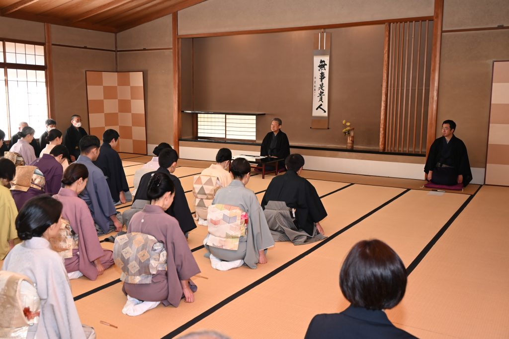 家元より「日々を過ごしている中で、『ああ、あの時こうしておけばよかった』と悔いが残る時があります。自分で変えていきたいところがあるならそれを念頭に、自分が良いと思ったことをやってみましょう。但し、思い込みが過ぎて周りに迷惑をかけていないかを考えることも大事です。今日が昨日より良い日になるよう、悔いのないように過ごしてください」と告辞。