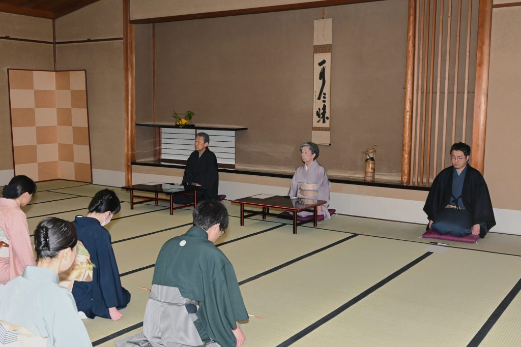 引き続き茶道会館1階茶室にて「稽古始め(茶席)」が行われ、学生たちは家元お心入れの取り合わせで、各服点にて濃茶を服しました。