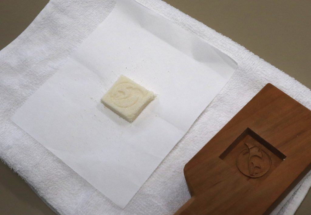 学園生が干菓子の落雁について簡単に説明した後、あらかじめ学園生が用意した材料を当学園のいちょうマークの型に押し固めて打ち出す、という押物の仕上げの工程を体験していただきました。