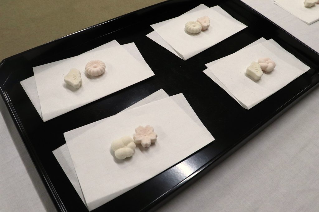 体育館のロビーに和親棚と野点傘を設えた呈茶席には選手以外の学生が総出で取り組み、約200名のお客様をおもてなし。京都製菓製パン技術専門学校に松や梅、菊、桜の花の形の干菓子を作っていただきました。