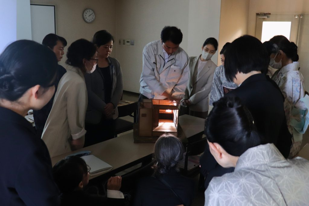 木材のサンプルを触って、その質感や重さの違いを体感。他に、茶室の模型に光を当てて実際に席入りした時の光の差し方を見せていただいた際には皆食い入るように注目していました。