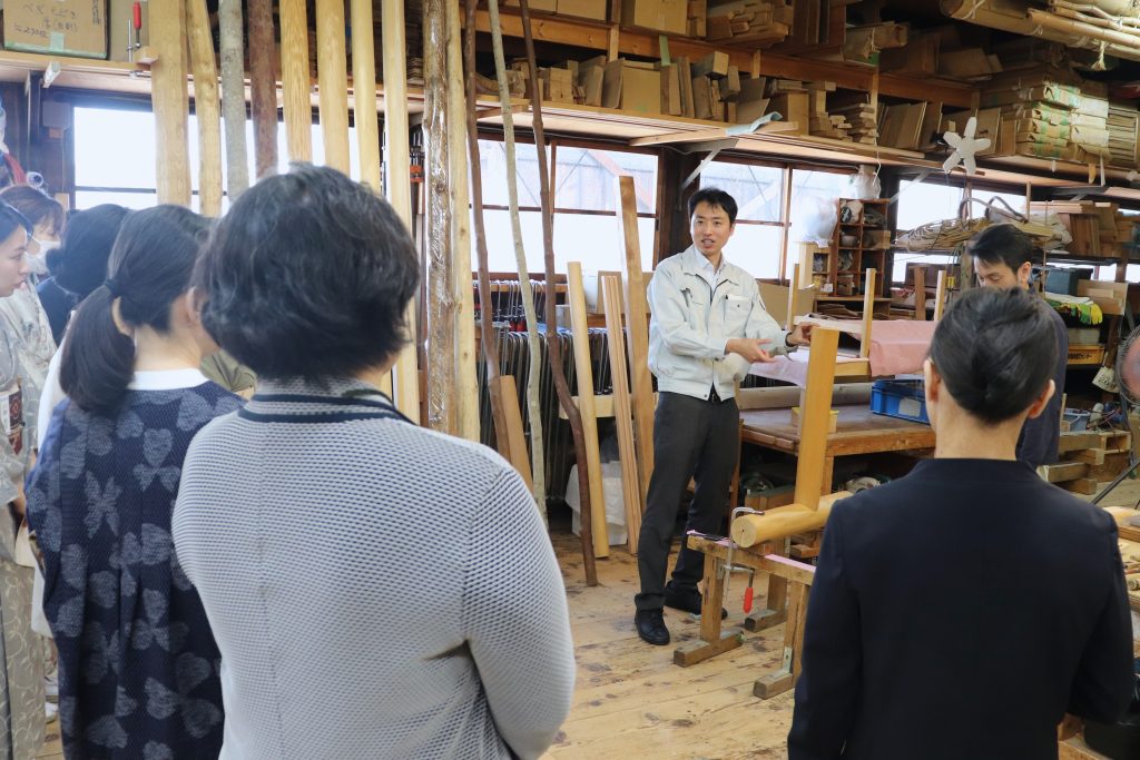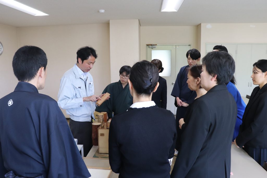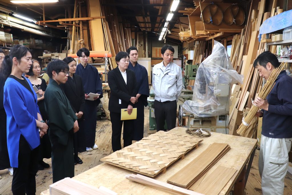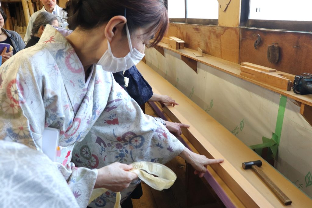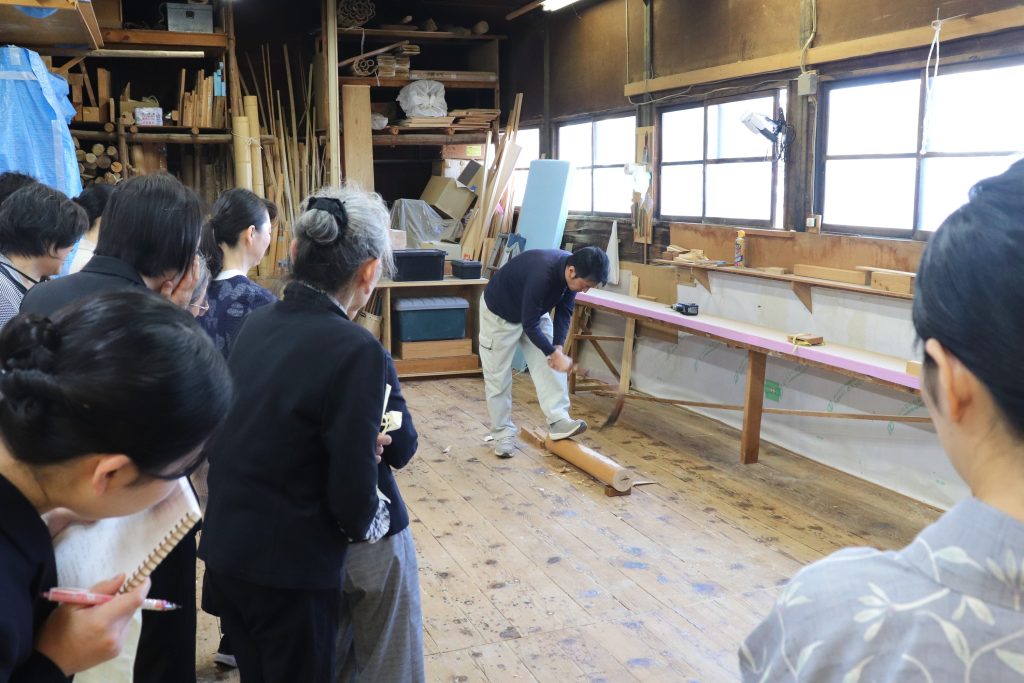 講義の後半には、実際に作業場にて職人による加工の様子を見学。木材に