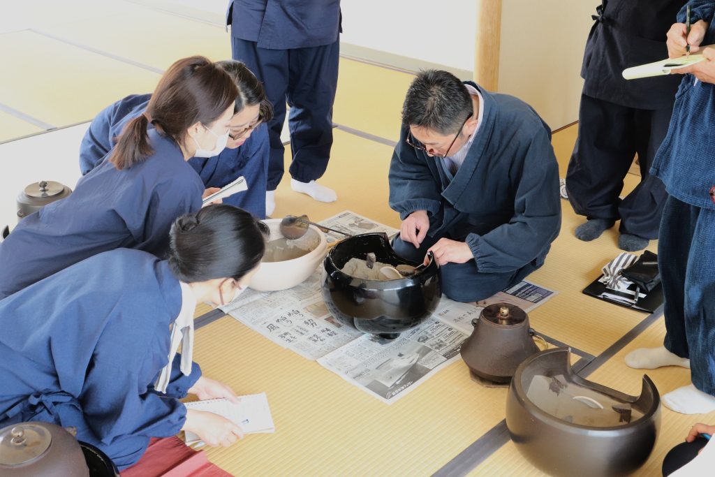 初めに講師がお手本として解説しながら灰形を切り、その後学生は1人ずつ当てられた風炉を目の前に実践。